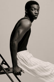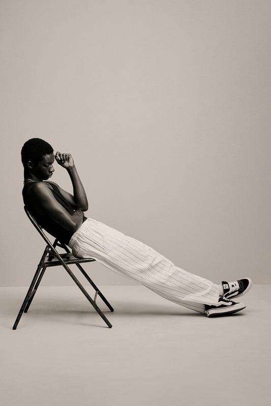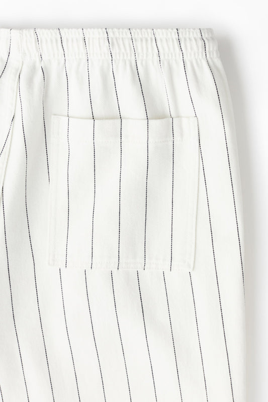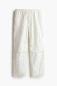 Trousers in soft cotton twill with an elasticated, drawstring waist, a fake fly, side pockets and an open back pocket. Legs that have pleats above and below the knees create added room for movement. Loose fit for a generous but not oversized silhouette.