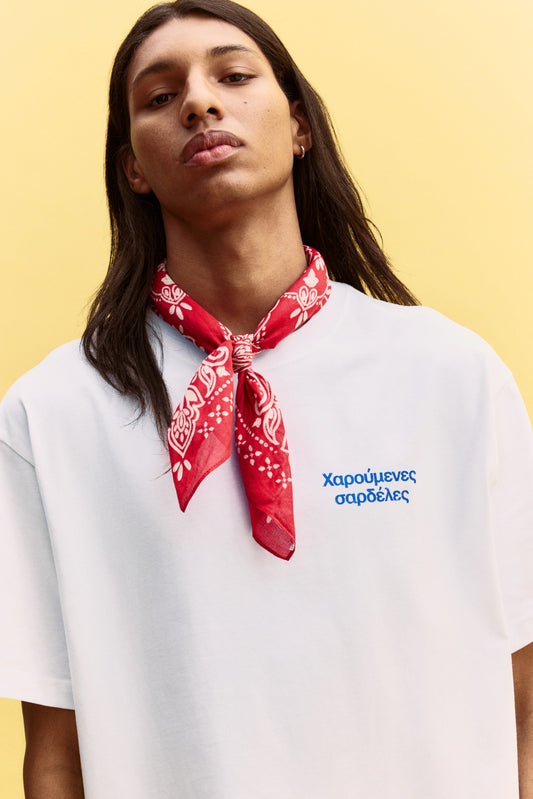 Description:White/Blue, Χαρούμενες σαρδέλες, Traditional greek sardines, Pyrgos, Greece, Sardines