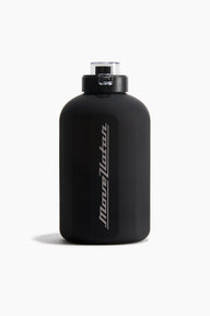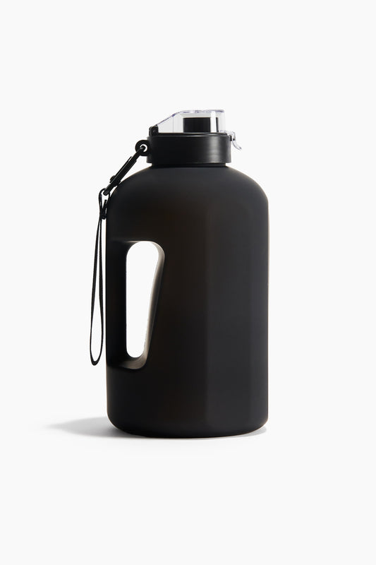 Plastic water bottle with a handle and a detachable wrist strap with a carabiner hook. Non-drip lid. 2.2 litres.